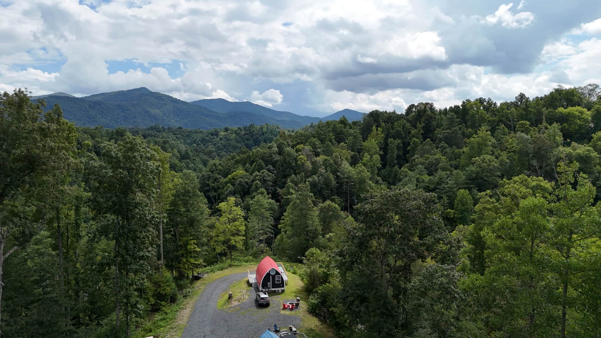 The Red Cabin at Candee Mountain Retreat combines sweeping Blue Ridge views with a wonderfully private hot tub experience. Set in a peaceful spot on the property, this arched cabin is designed for guests who value both comfort and seclusion.