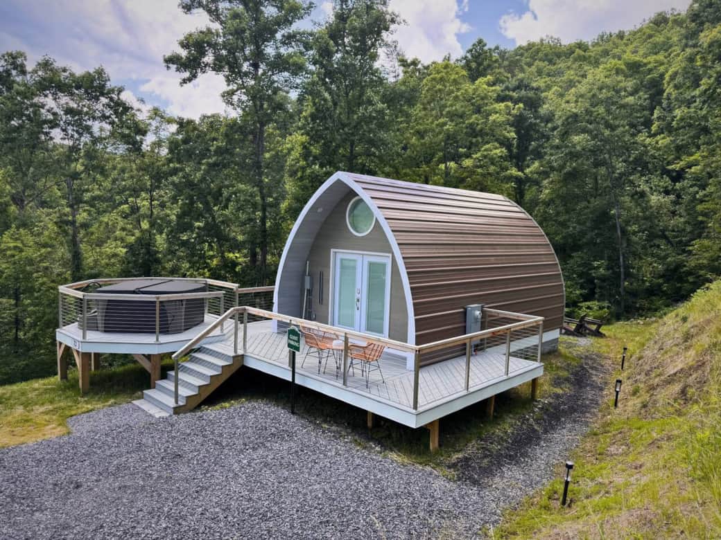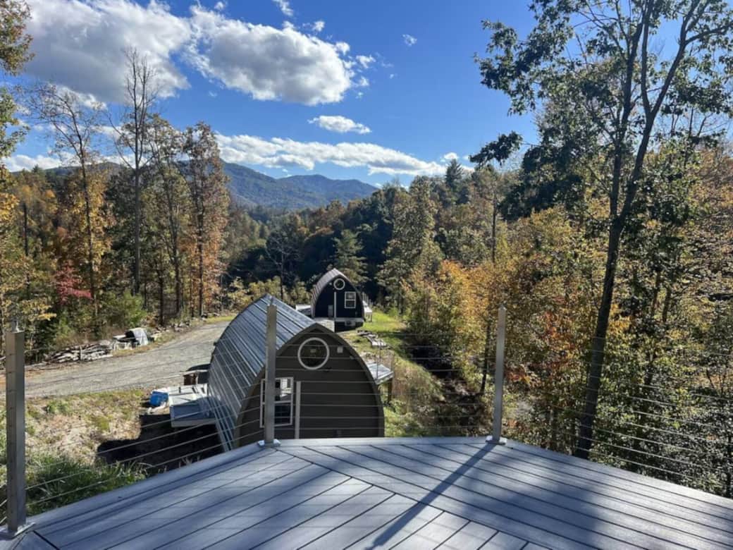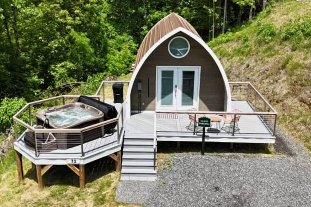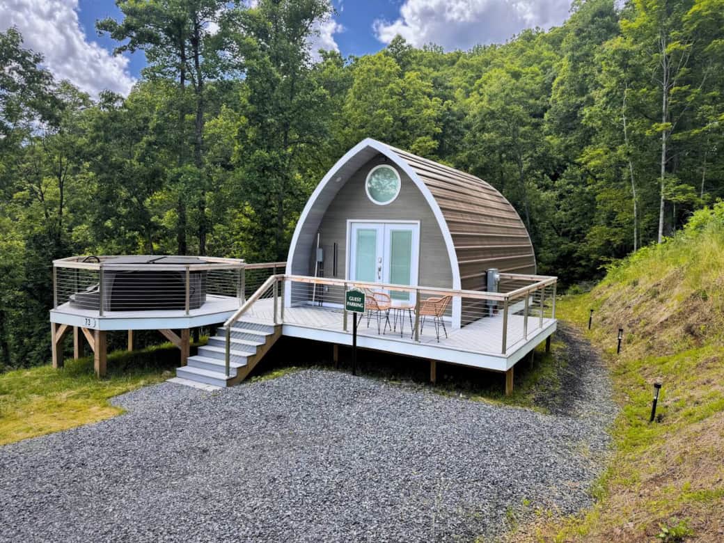Candee Mountain Retreat in Bakersville, NC is a romantic Blue Ridge getaway. Our cozy arched cabins feature a queen bed, full bath, kitchenette, sofa, smart TV, and coffee maker. Outside, relax in your private hot tub, enjoy a campfire, and take in mountain views. The perfect blend of comfort, charm, and seclusion for couples.